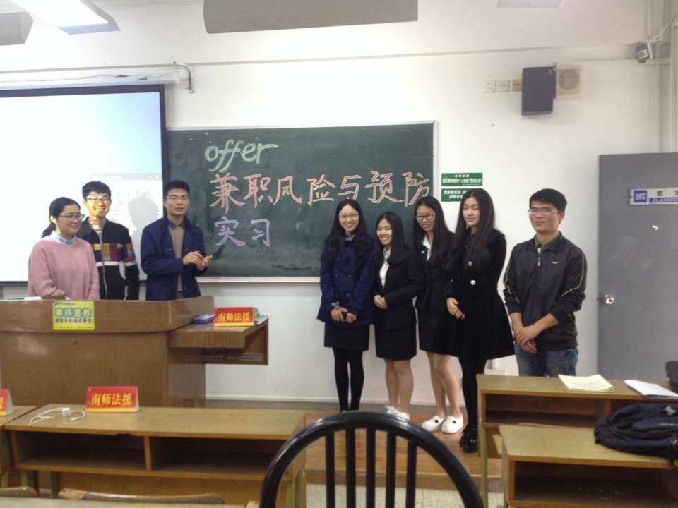 2016年4月27日星期三下午,南师法援劳动部全体成员在南师大学明楼成功举办了主题为大学生兼职实习工作的风险与预防的普法讲座。