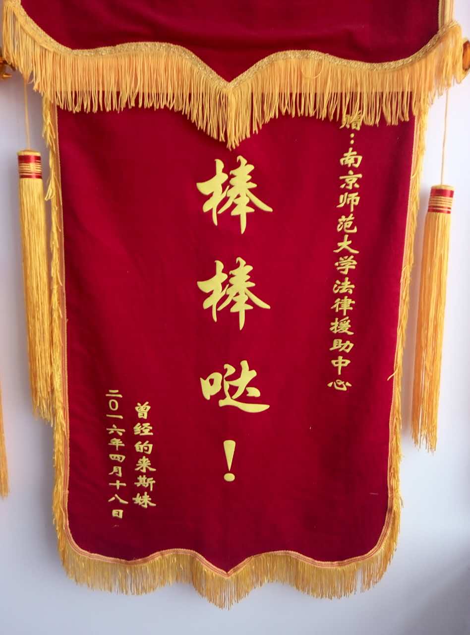 法律援助中心援助的当事人高某为表感谢,特意送来一面锦旗。她对南师法援对她提供的代理和帮助表示由衷的感谢,对南师法援提供的劳动纠纷咨询和劳动仲裁代理高度赞赏,同时也希望南师法援能越做越好。