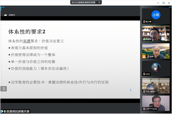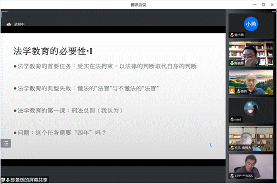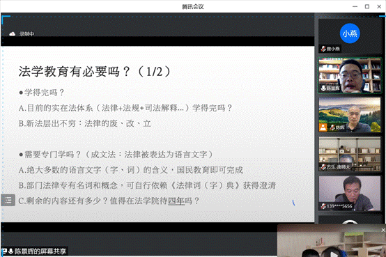 数百名师生通过腾讯会议参加线上会议,共同聆听了陈景辉老师以“什么是法律人”为主题的精彩分享。