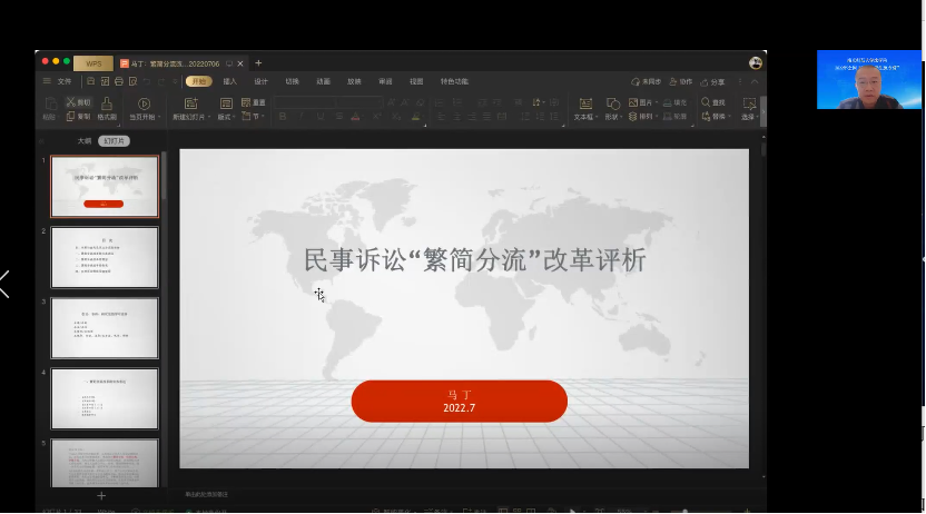 马丁副教授的报告题目是《民事诉讼繁简分流改革评析》。马丁教授对繁简分流改革的文本表达、背景、成效和民事诉讼制度发展展望进行了分析。