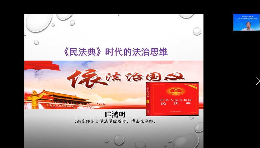 眭鸿明教授的主讲题目是《<民法典>时代的法治思维》,就《民法典》时代典型的三个法治思维——坚持人民中心、参与国家治理、公序良俗进行了阐述和分享。