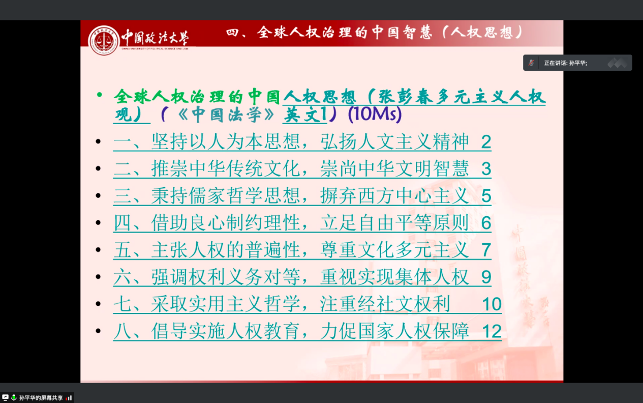 在正式的专题讲座中,孙平华教授围绕“全球人权治理”展开,讲述张彭春的个人事迹及其对国际人权事业的贡献,突出展现全球人权治理的中国智慧,并分享在“全球人权治理的中国智慧”研究过程中的心路历程。讲座内容共分为七个部分。