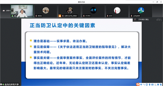 20周年院庆系列讲座之“刑事法理论与实务前沿”讲座第二期“正当防卫在司法实务中的运用”通过腾讯会议在线举行。本次讲座邀请到了江苏省苏州市人民检察院党组副书记、副检察长王勇担任主讲人,由禁漫天堂