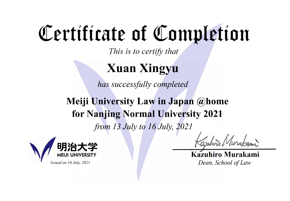的学子与明治大学师生进行友好交流,通过线上讲解、学术讲座和互动答疑等形式,促进彼此之间的了解,感受明治大学的研究氛围和人文情怀,同时对日本法律有了进一步的学习与理解。除此以外,同学们也就中日文化等展开了热烈的交流与讨论,取得了良好的效果,同学们在夏令营结束后提交了学习感悟,分享了自己的心得与收获,明治大学也为同学们颁发了结业证书。