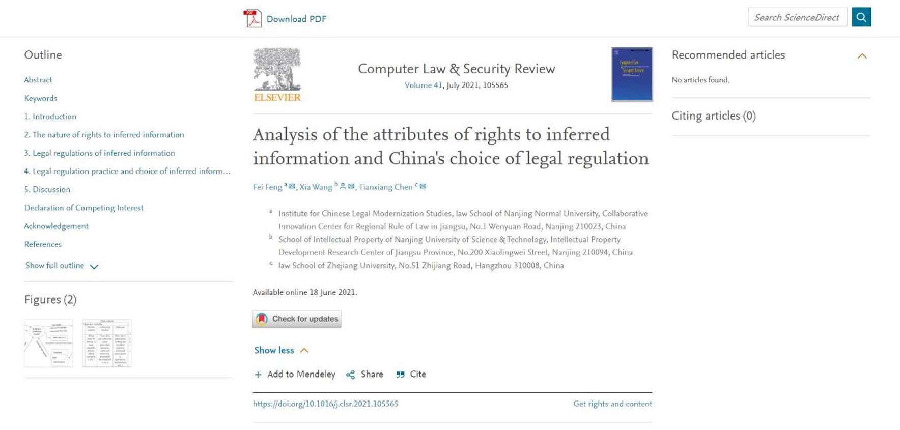 副院长丰霏副教授在国际科技法律期刊《计算机法律与安全评论(Computer Law & Security Review)》上以第一作者身份发表学术论文《Analysis of the attributes of rights to inferred information and China's choice of legal regulation》。