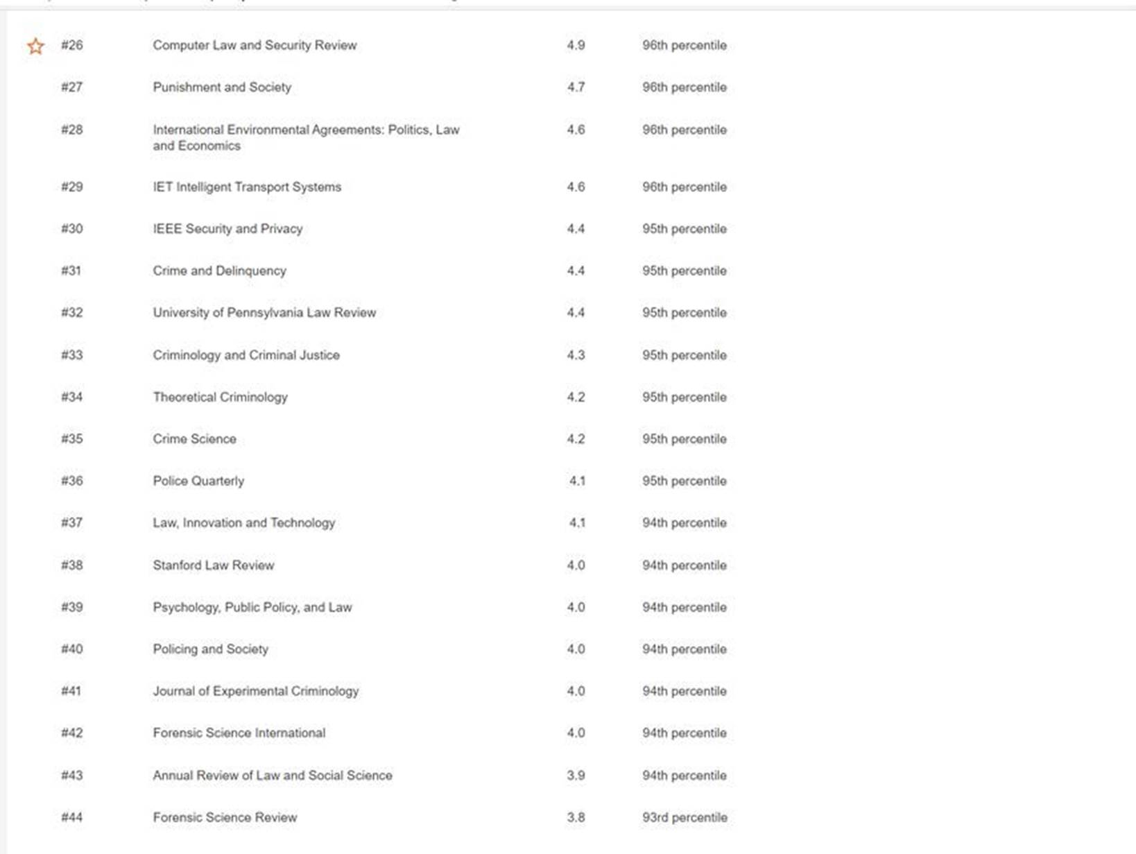 Computer Law & Security Review同时被SSCI和SCOPUS收录。在SSCI统计中,该刊2020的影响因子为1.849,位于SSCI一区。该刊2020年的引用因子(CiteScore)为4.9,位居26位,超过University of Pennsylvania Law Review、Stanford Law Review、Yale Law Journal、University of Chicago Law Review等。