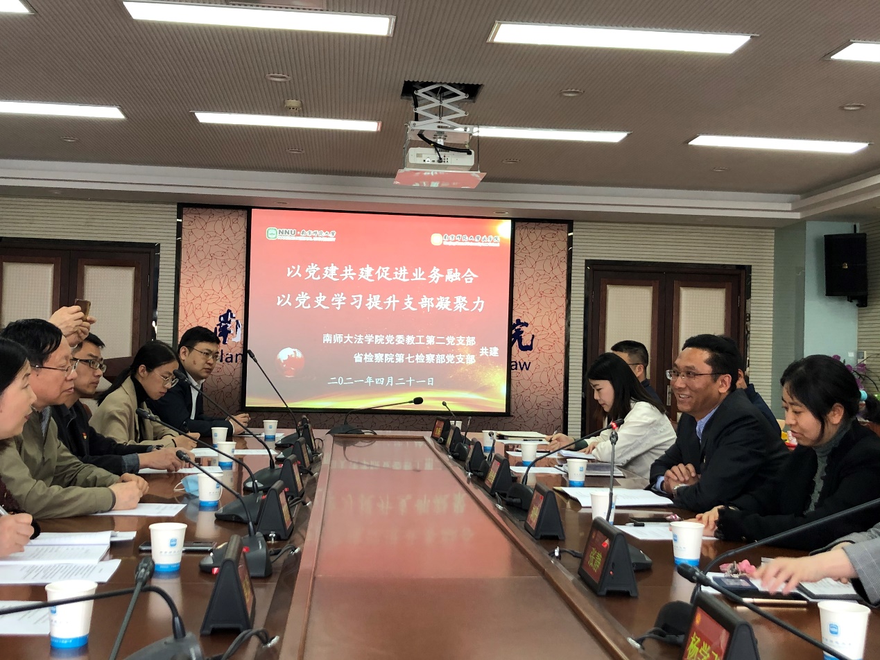 就支部党建和业务相融合的合作方式,双方也进行了深入的交流。周主任以公益诉讼中遇到的生态环境、食品安全等真实情况举例,提出双方党建共建需要达成的主要目标。李浩教授和陈爱武教授也表达了自己的观点。李浩教授指出,江苏省公益诉讼是走在全国前列的,做出过很多有益的尝试,相信通过双方合作公益诉讼会做的更好。赵杰教授结合鉴定工作指出,虚假诉讼也是双方应该关注的领域,检察院的参与对于解决该问题非常有帮助。最后,双方深入交流党史学习教育的体会。徐宁娜检察官指出:经过艰苦卓绝的奋斗,共产党带领我们获得了一个又一个胜利。党史记载的很多历史都值得我们借鉴,可以转化为工作的方法。我们需要用党的理论创新武装我们的头脑,联系并运用到工作之中。张静检察官也分享了自己学习党史的经历。周主任结合毛主席的经历,指出工作中要不存私心、不畏苦难。赵杰教授等多位老师也踊跃发言。李老师指出,必须要“不忘初心、牢记使命”,要注重学习党史中的检察工作等法律工作经验。陈老师分享了自己借助学习强国等学习平台学习党史的经历。