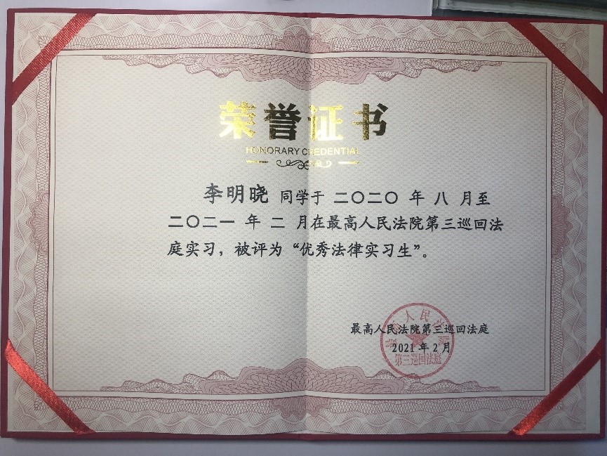 在为期近六个月的实习期间,张子炎、刘志远和李明晓同学能够遵纪守法,认真负责、积极参与各类活动,努力完成实习单位领导交给的各项工作,较好完成了各项工作任务。三位同学分别协助带教法官处理多起民事、刑事案件,积极配合团队审判工作,对争议案件的法律适用积极参与讨论并发表独到见解,促使自身法律理论水平与实践能力取得长足进步。三名同学学习的积极性、谦虚好学的态度得到了带教老师的一致肯定。他们在主审法官的精心指导下,夯实知识基础,提升专业素养,深刻体会“努力让人民群众在每一个司法案件中都感受到公平正义”的要求,最终也获得他们拼搏而来的荣誉。希望受到表彰的同学能够在今日的工作中再接再厉,锐意进取,在实践中不断提升司法能力,继续发扬最高人民法院追求卓越的精神,在了解社会、服务社会中全面成长。