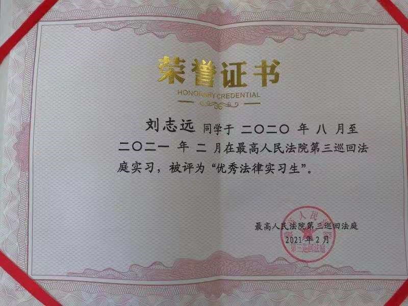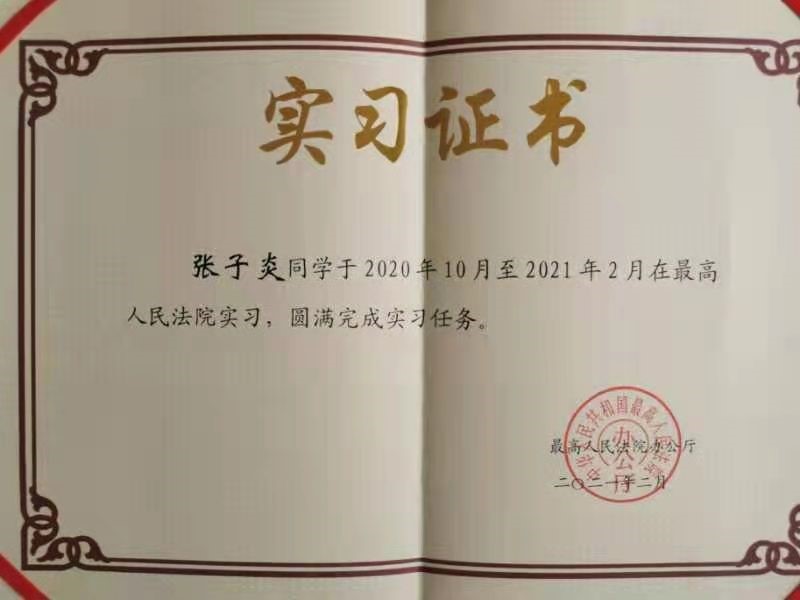 进一步贯彻落实最高人民法院法律实习生制度,通过院内层层选拔和最高人民法院的考核,最终有硕士研究生张子炎同学成功赴最高人民法院实习并获得优秀实习生的称号,同时有硕士研究生刘志远、本科生李明晓2位同学入选成为最高人民法院第三巡回法庭第六批法律实习生并获得了“优秀法律实习生”的称号。