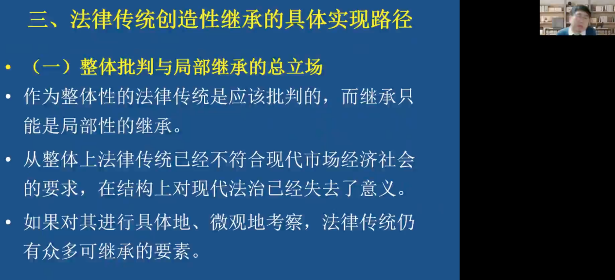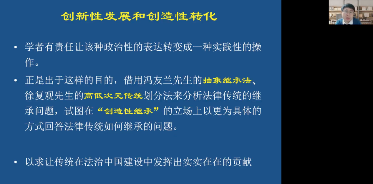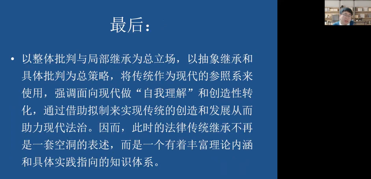 在结语部分,李拥军教授总结到,要以整体批判与局部继承为总立场,以抽象继承和具体批判为总策略,将传统作为现代的参照系来使用,强调面向现代做“自我理解”和创造性转化,通过借助拟制来实现传统的创造和发展从而助力现代法治。因而,此时的法律传统继承不再是一套空洞的表述,而是一个有着丰富理论内涵和具体实践指向的知识体系。