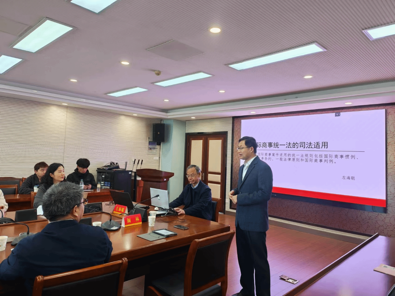 接下来,左海聪教授介绍了本次学术报告的基本框架:一是国际商事惯例的适用;二是国际商事条约的适用;三是国际商事一般法律原则的适用,四是国际商事判例的适用与参照。