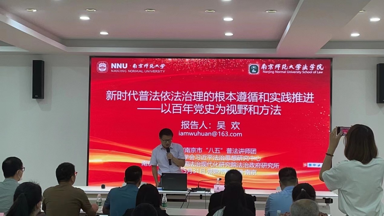 副教授吴欢以“新时代普法与依法治理的根本遵循与实践推进——以百年党史为视野和方法”为主题,结合常熟市司法普法现状,分析了党的二十大报告中的“法”字及其语义解读,介绍了中国式法治现代化的理论内涵,提出普法要从法律知识普及转变为培育法治认同的观点,并且倡导学员们通过普法依法治理讲好中国法治故事、弘扬中国法治自信。